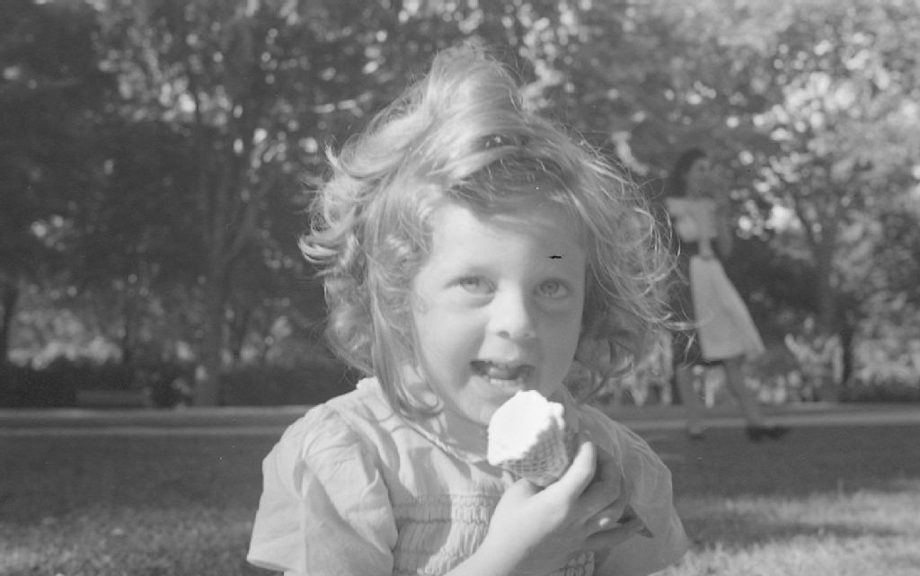 Pierrette Lambert mange un cornet de crème glacée au parc Lafontaine à Montréal