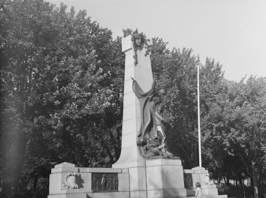 Pierrette Lambert se tient devant le monument à Dollard des Ormeaux du sculpteur Alfred Laliberté au parc Lafontaine à Montréal