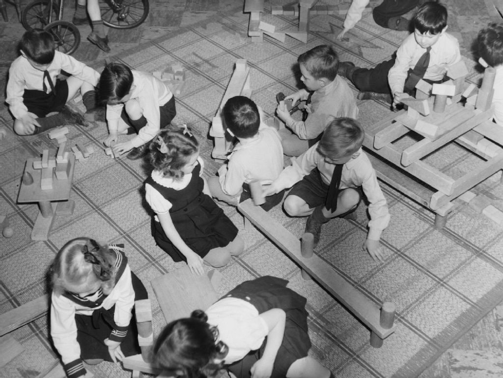 Les élèves de la maternelle de la «Montreal High School» s'amusent avec des jeux de construction en bois. Mademoiselle A. L. Baizley est l'enseignante de ces enfants