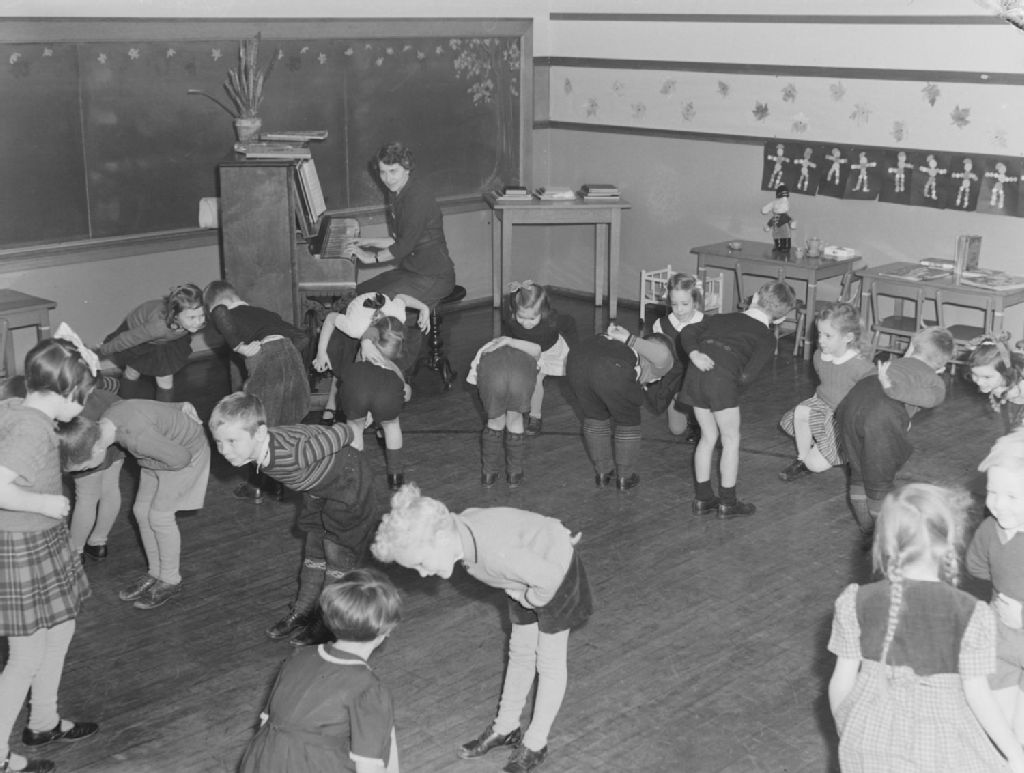 Des couples d'enfants font la révérence lors d'un cours de danse avec une pianiste accompagnatrice à l'école Rosedale située au 4575, avenue Mariette à Montréal
