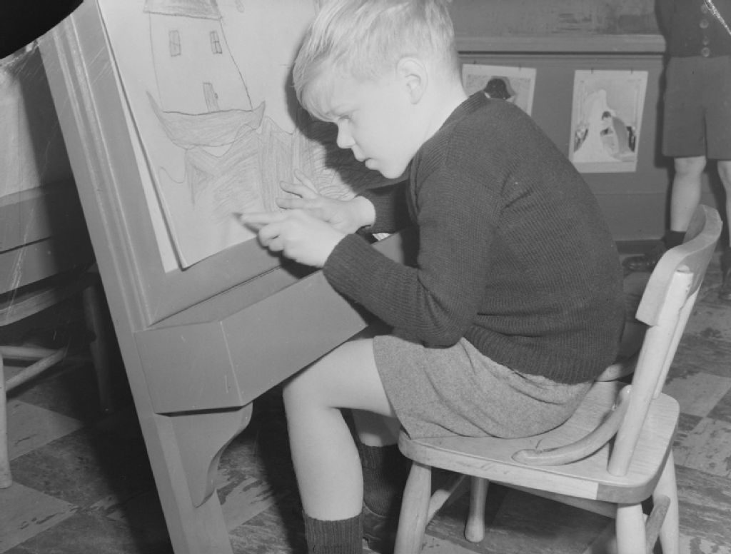 Nous voyons Ian McLachlin, écolier de la «Côte(-)des[-]Neiges Protestant School» située au 3706, avenue de l'Oratoire (devenue rue Coronet) à Montréal. Assis devant un chevalet, il fait un dessin avec un crayon de cire