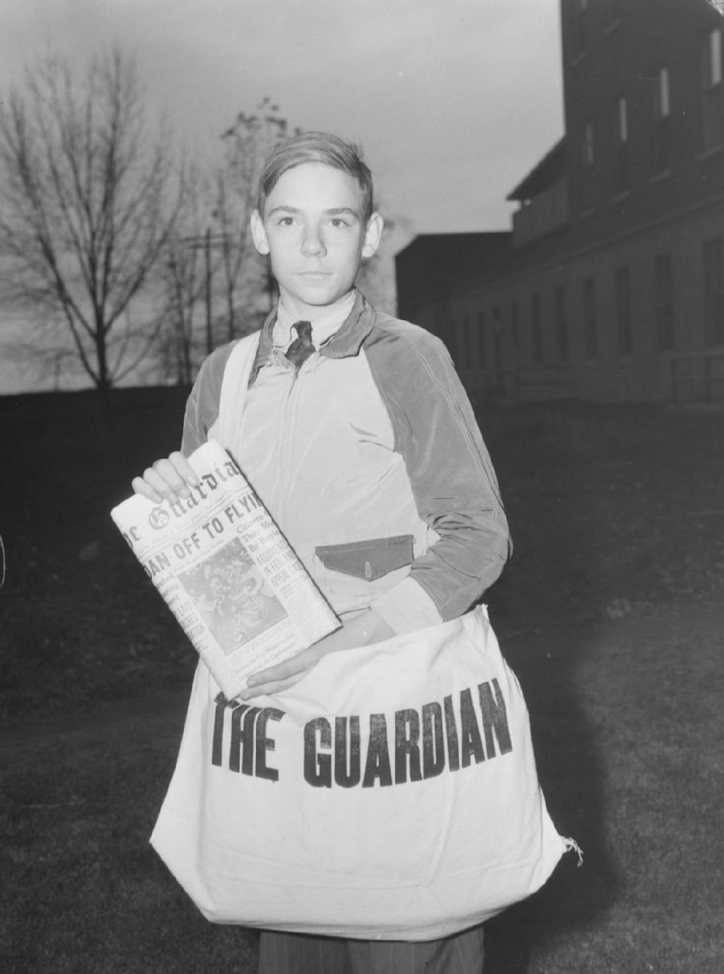 Nous voyons un camelot, sac en bandoulière, distribuant le journal «The Guardian» dans les rues de Montréal