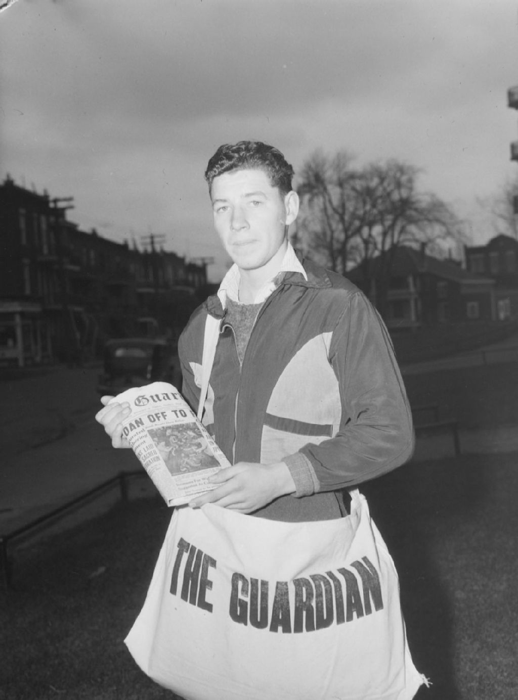 Nous voyons un camelot, sac en bandoulière, distribuant le journal «The Guardian» dans les rues de Montréal