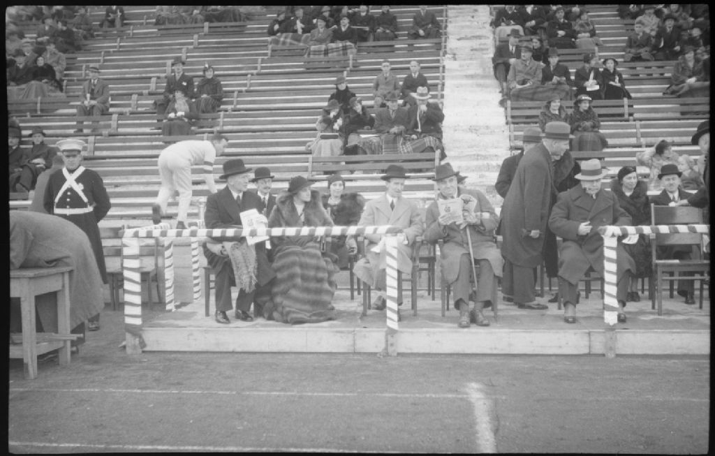 John Buchan (Lord Tweedsmuir), gouverneur général du Canada, assiste à un match de football depuis la loge d'honneur du stade Percival Molson de l'Université McGill à Montréal