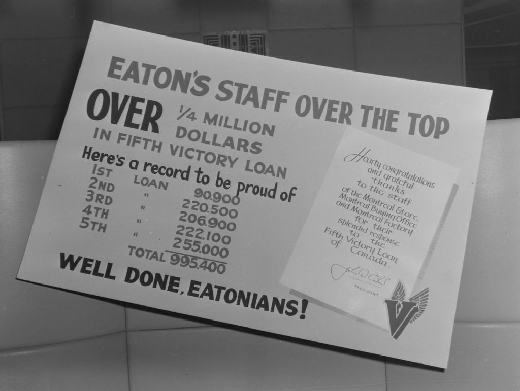 Nous voyons une affiche qui félicite le personnel du magasin Eaton, situé rue Sainte-Catherine Ouest à Montréal, pour sa contribution au cinquième prêt pour soutenir l'effort de guerre, le «Victory Loan». La somme recueillie pendant cette campagne de financement auprès des employés d'Eaton a totalisé plus d'un quart de million de dollars