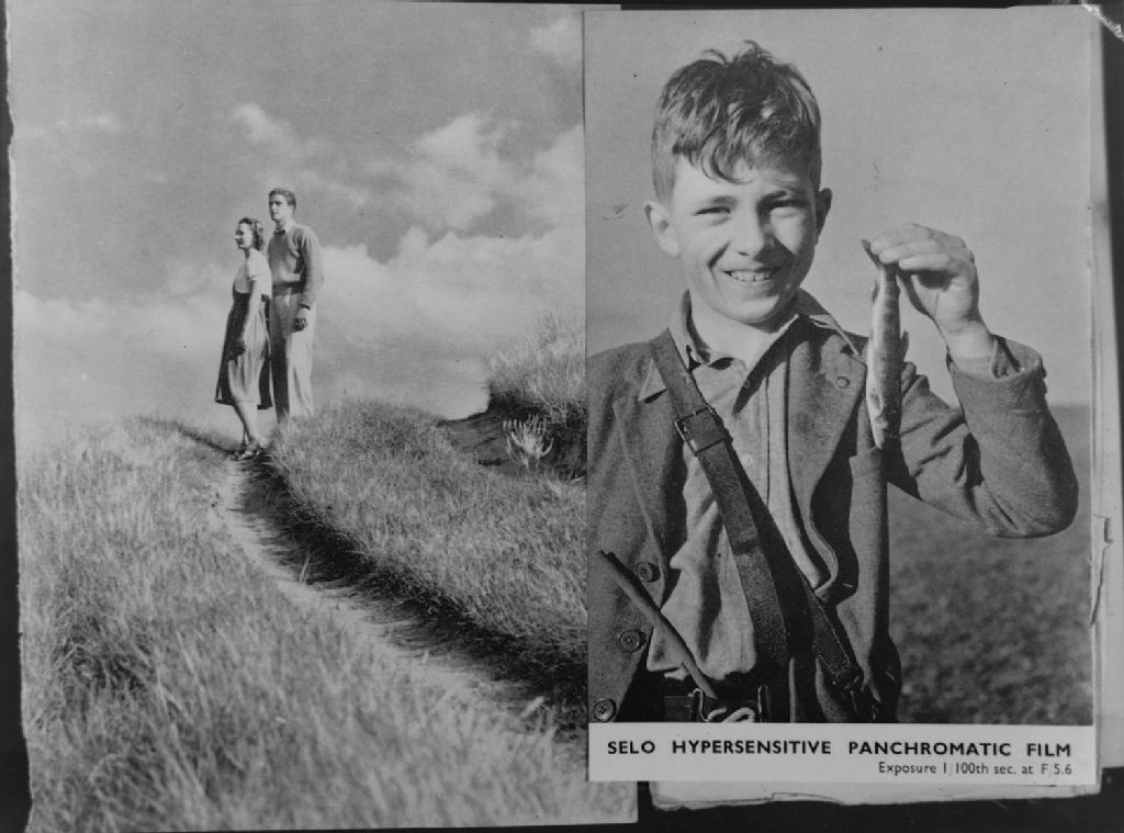 Nous voyons la copie de deux photographies de scènes champêtres. L'une représente un couple marchant dans un sentier, l'autre un jeune pêcheur fier de sa prise