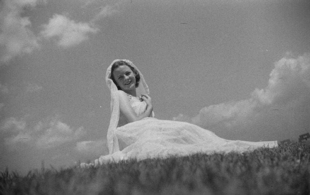 Joyce Booth du «Thumbs Up Ballet», vêtue et coiffée de voiles transparents, est assise sur l'herbe dans un champ