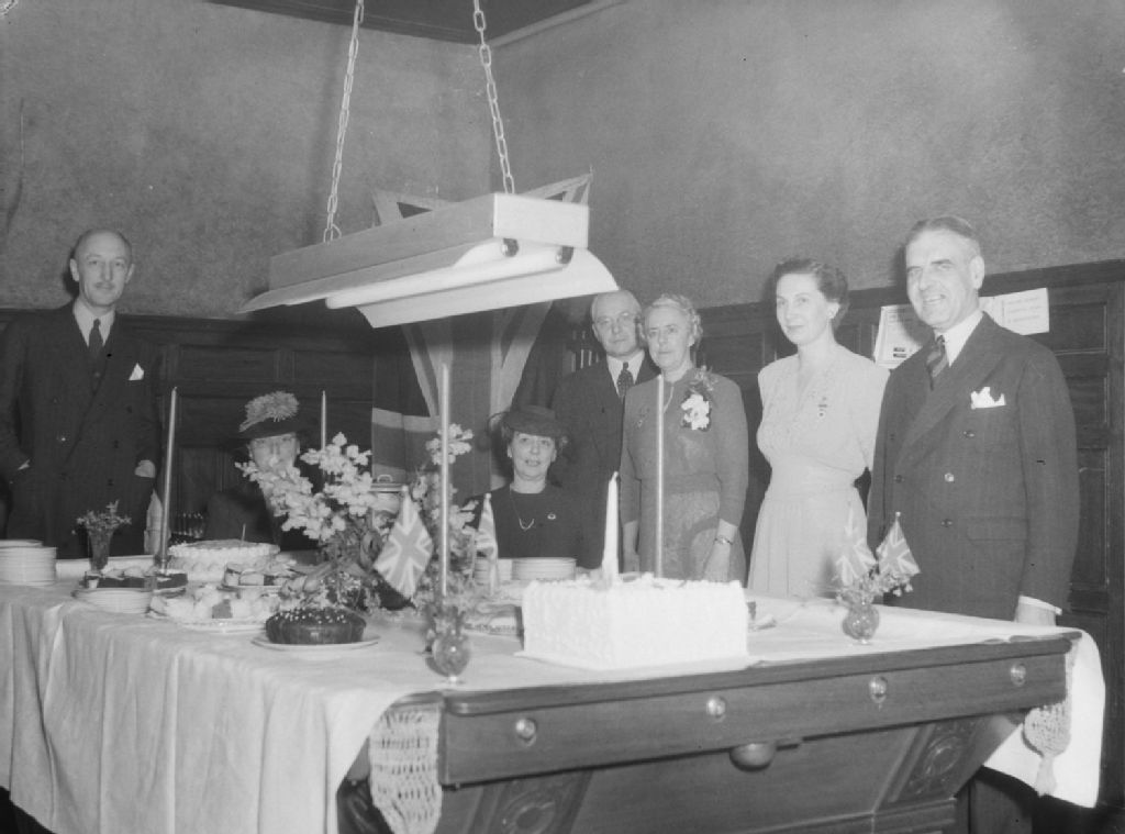 Des convives sont réunis dans la salle de billard de la maison d'accueil des officiers. Nous voyons des gâteaux sur la table de billard recouverte d'une nappe