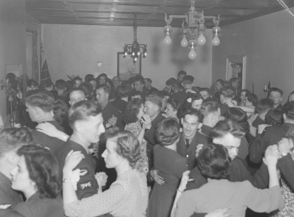 Des officiers de l'armée de l'air et leurs compagnes dansent dans une salle de la maison d'accueil des officiers