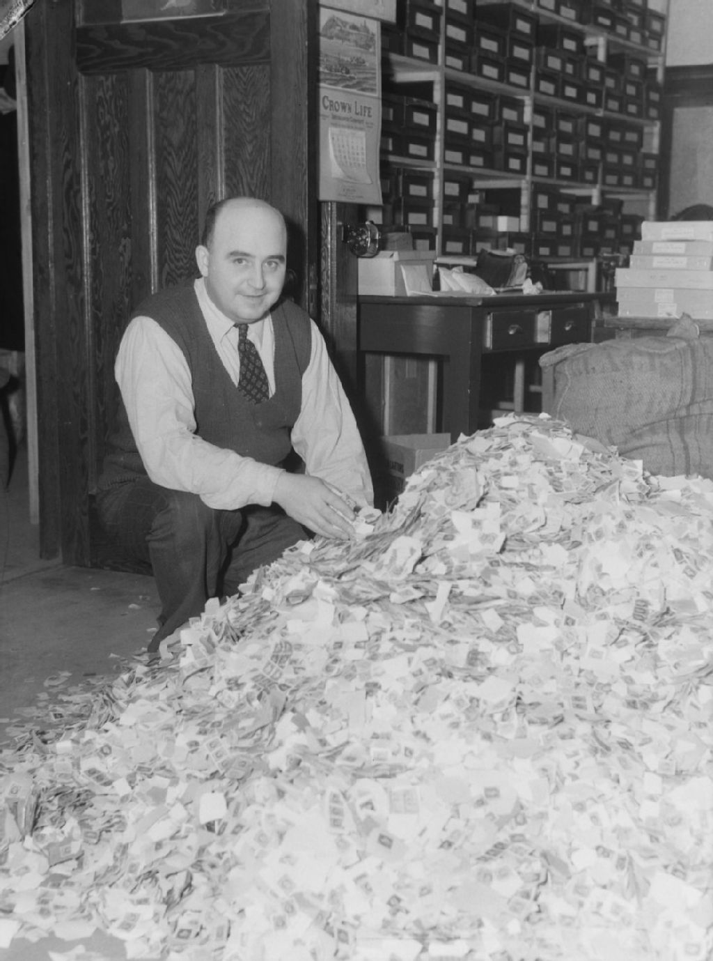 Nous voyons monsieur P. B. Papachristidis devant un amas de timbres jonchant le sol de sa boutique de philatélie située rue Saint-Denis à Montréal