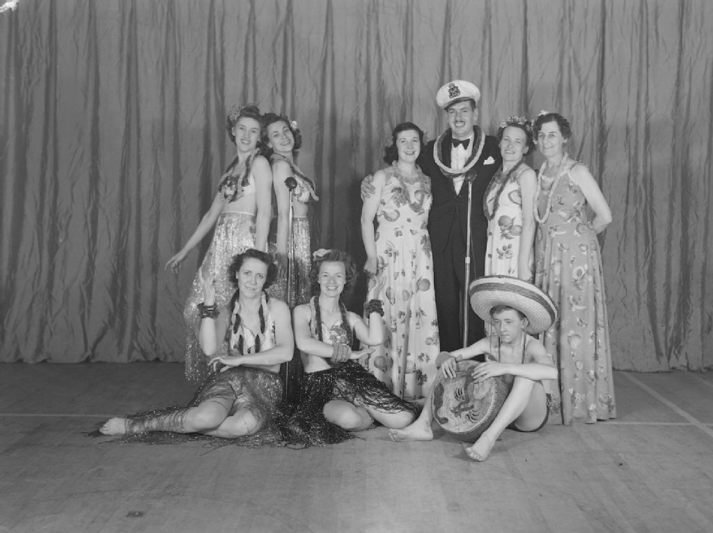 Nous voyons des jeunes femmes en costumes hawaïens, un joueur de tam-tam coiffé d'un sombrero et un homme portant une casquette de capitaine pendant une représentation de la revue musicale «Thumbs Up»