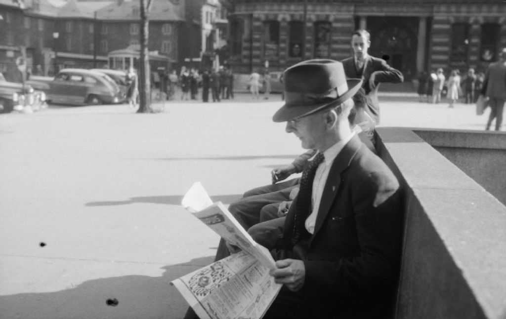 Un homme lit son journal assis au square Phillips à Montréal