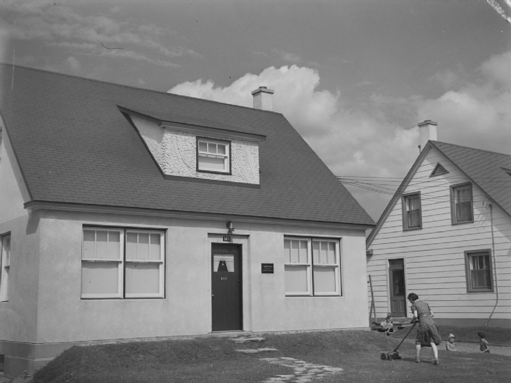 Madame Adrien Angers pousse la tondeuse mécanique sur le gazon devant la maison située au 5851, rue Viau à Montréal. Cette maison fait partie d'un nouveau développement résidentiel