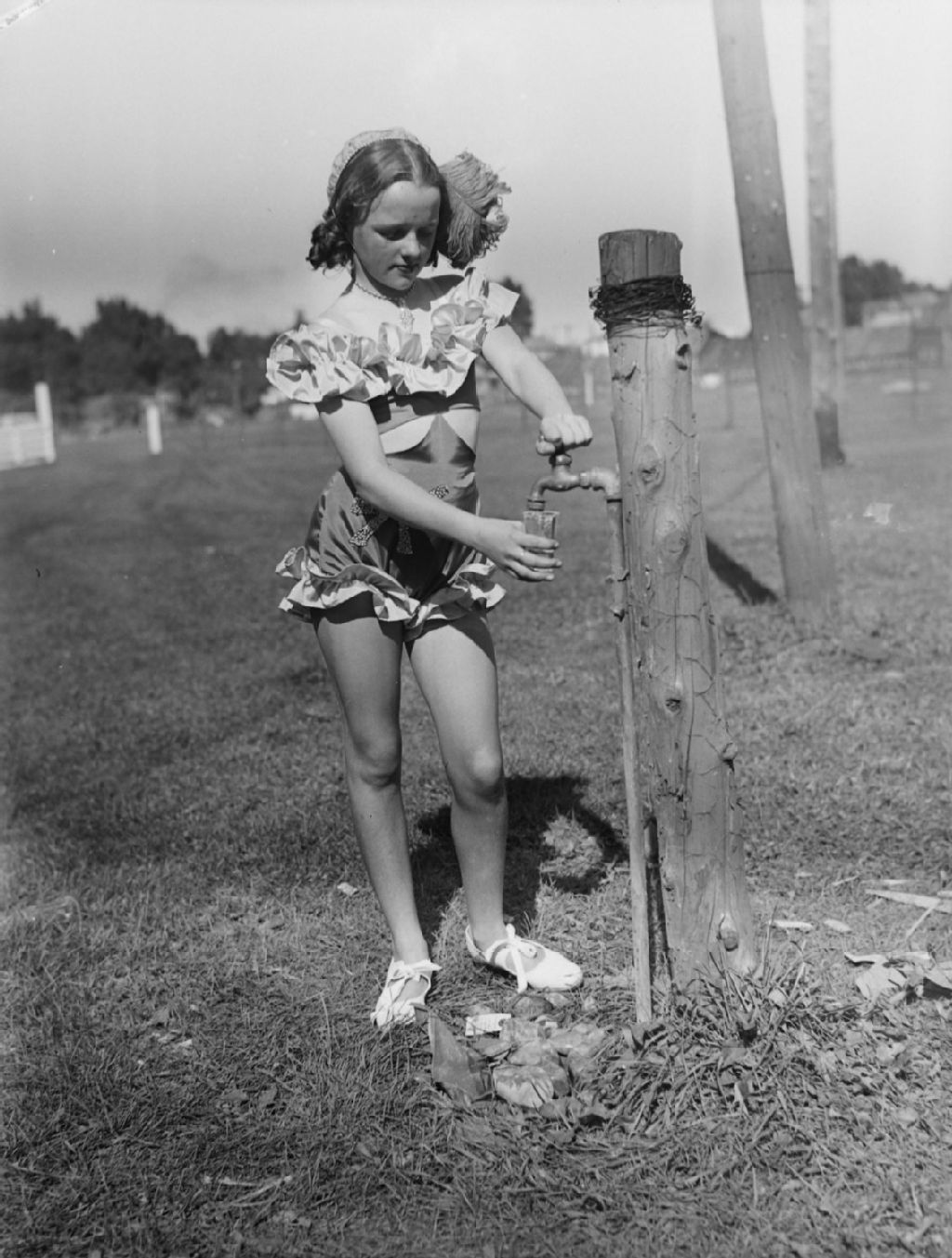 Helen Findlay remplit un verre d'eau à un robinet fixé à une clôture au milieu d'un champ. Cette fillette danse dans la revue musicale «Thumbs Up» présentée à Malone dans l'État de New York (États-Unis)