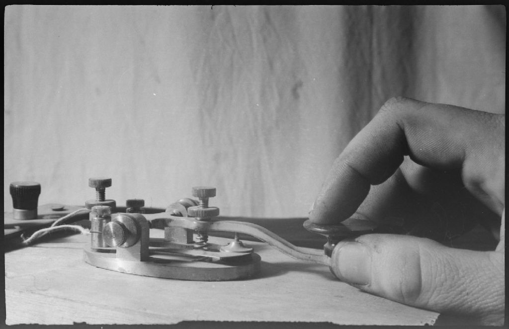 Un main actionne une clé de saisie pour la radio-communication (radio amateur à ondes courtes) par code morse