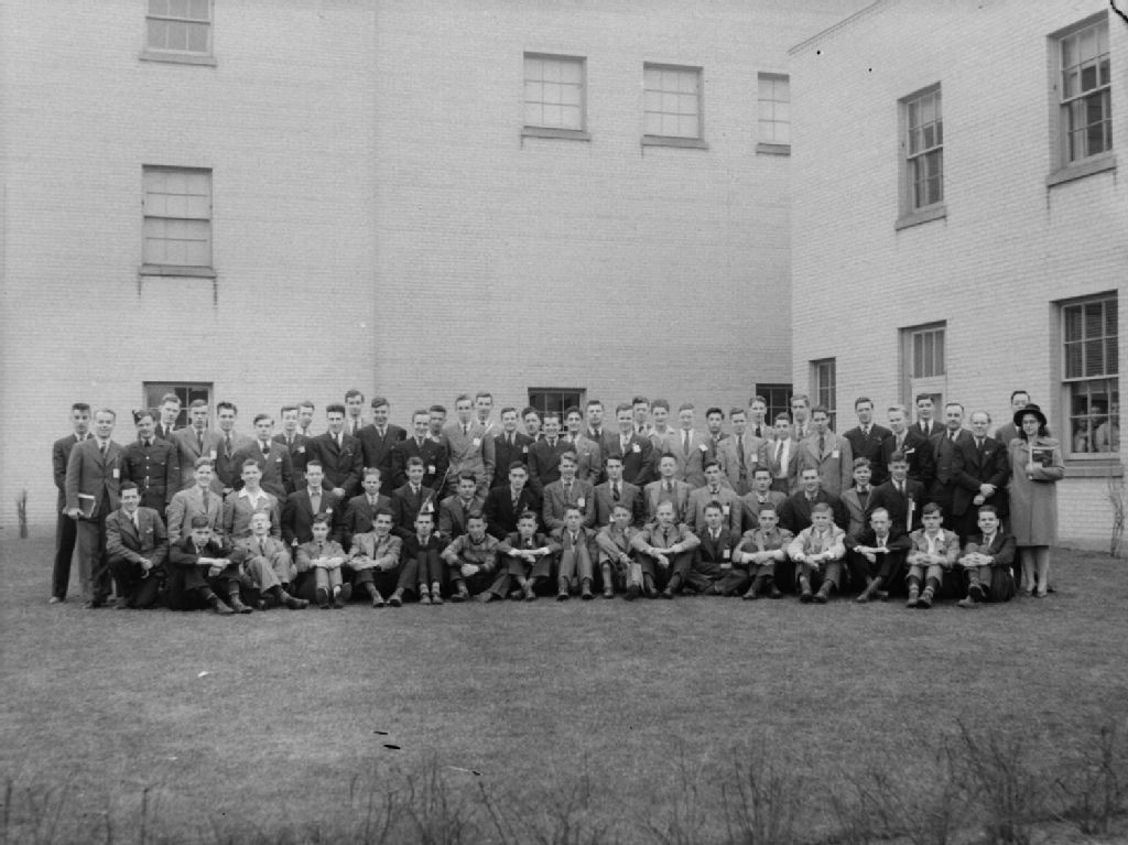 Nous voyons un groupe d'une centaine de participants à un congrès «Hi Y» devant l'édifice de la Young Men's Christian Association (Y.M.C.A.) du quartier Notre-Dame-de-Grâce à Montréal
