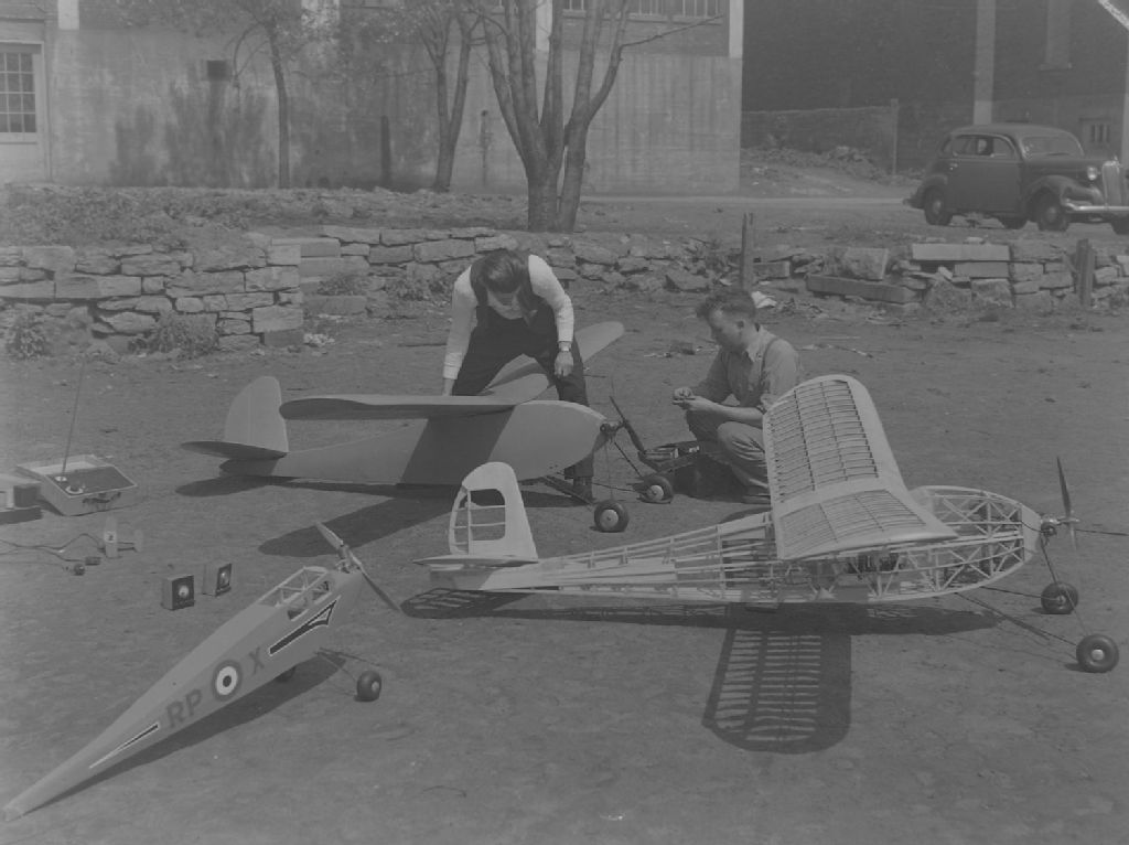 Nous voyons Harris Pound et un jeune homme avec trois modèles réduits d'avions téléguidés. Ils sont dans un champ devant un muret de pierres