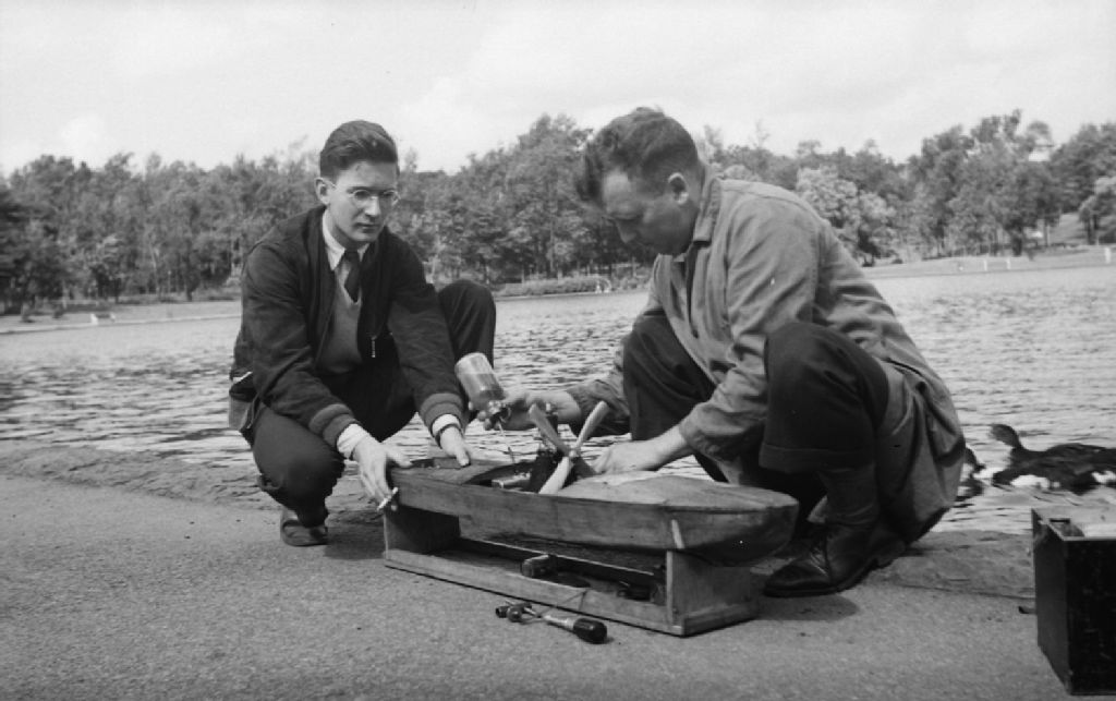 Harris Pound, aidé d'un jeune homme, huile une pièce sur un modèle réduit de bateau à moteur. Ils sont au bord de l'eau