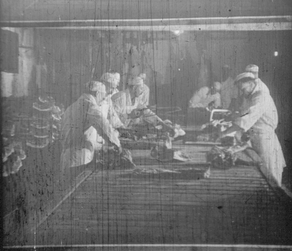 Nous voyons la photographie d'un négatif représentant plusieurs bouchers débitant des quartiers de porc sur un établi dans un abattoir