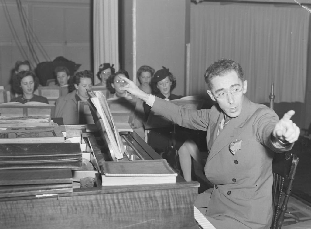 Un pianiste accompagnateur fait répéter le choeur avant l'enregistrement d'opéras par la Société Radio-Canada (CBC) à la salle de l'Ermitage du Collège de Montréal