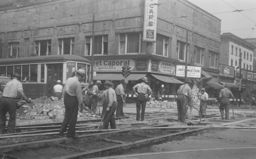 News. Men at Work : Bleury & St. Catherine, 19 juillet 1943, Archives nationales à Montréal, Fonds Conrad Poirier, (06M,P48,S1,P9349), Poirier, Conrad.