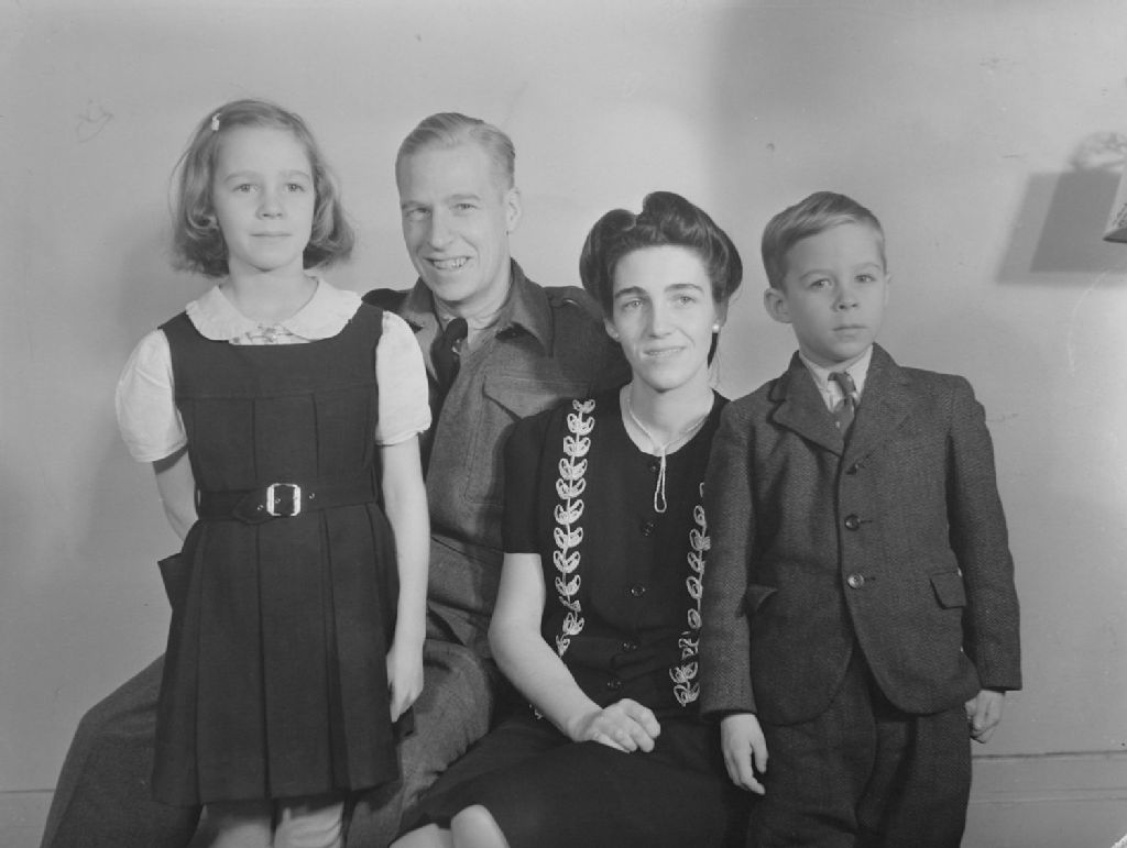 Nous voyons un soldat de l'armée canadienne avec sa femme et ses deux enfants