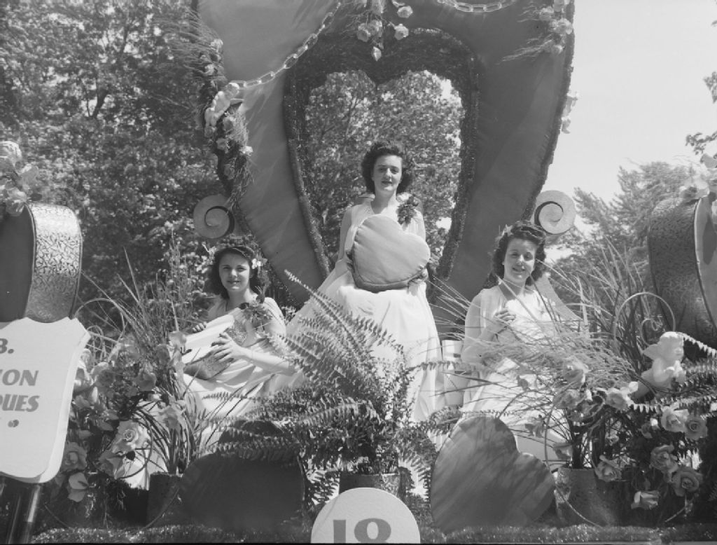 Parade. Dupuis Frères. Maurice Lachapelle, 6789 Faucher. Jacqueline Bourget, Marie Jeanne Maitre, Cécile Normand, 24 juin 1943, Archives nationales à Montréal, Fonds Conrad Poirier, (06M,P48,S1,P9397), Poirier, Conrad.