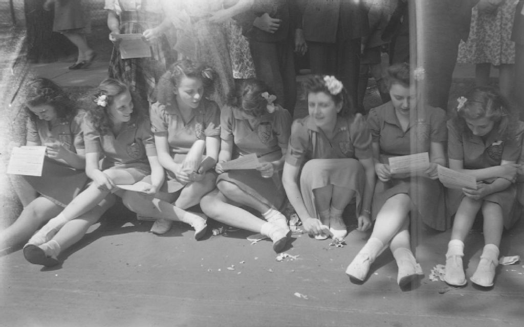 Des étudiantes en uniforme sont assises sur le bord du trottoir pendant le défilé de la saint Jean-Baptiste à Montréal