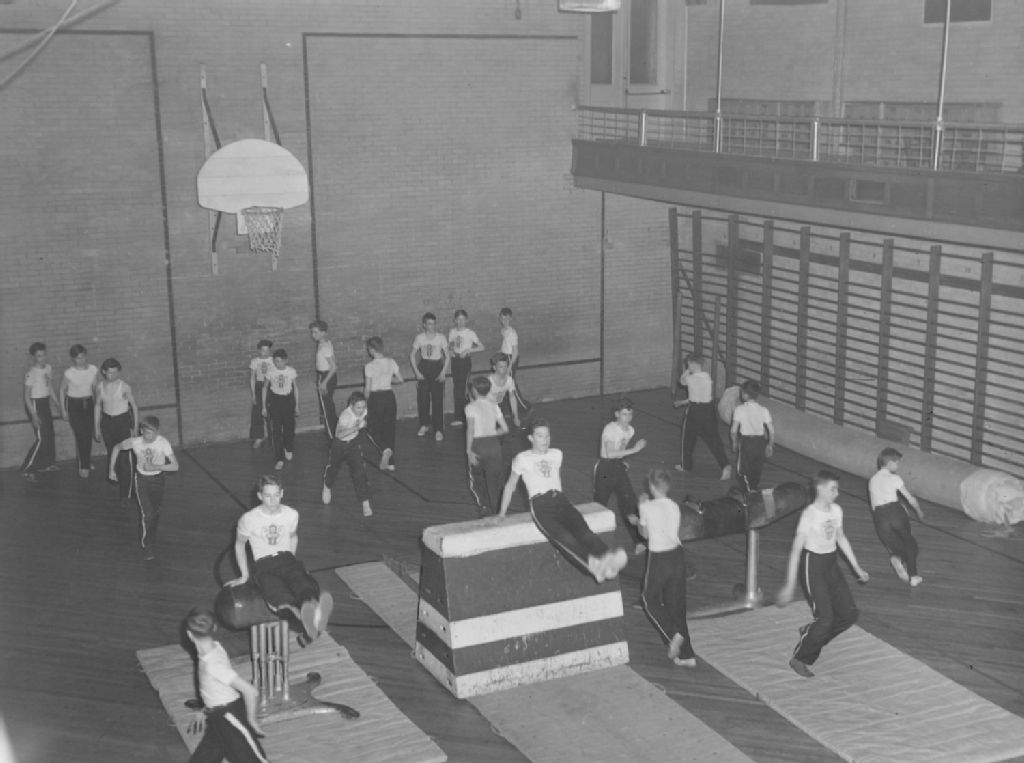 Des élèves de la «Westmount Intermediate School» font de l'athlétisme dans le gymnase de l'institution. Nous apercevons un cheval-sautoir, un cheval d'arçons et un panier de basket-ball