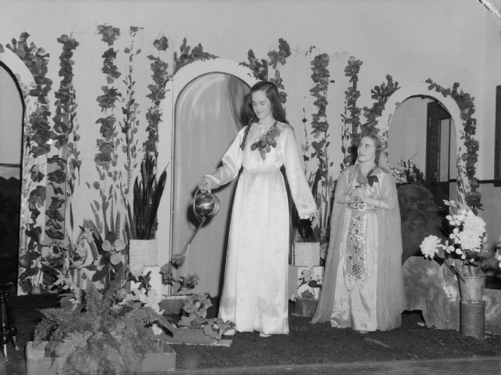 Deux jeunes comédiennes jouent dans une pièce de théâtre sur la scène de la «St Paul's Academy» située au 11, chemin de la Côte-Saint-Antoine à Westmount. Une comédienne arrose des fleurs avec un arrosoir, l'autre tient une fleur