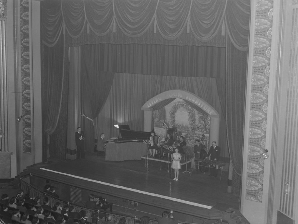 Un orchestre accompagne une chanteuse amateure sur la scène du «Chateau Theatre» situé rue Saint-Denis à Montréal. Ce spectacle, diffusé par la station de radio C.K.A.C., est commandité par «Living Room Furniture Mfrs Ltd»