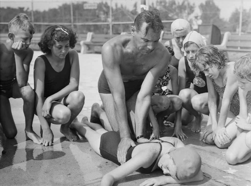 Le moniteur-sauveteur Leo Belec donne un cours de premiers soins à un groupe de jeunes baigneurs sur le bord d'une piscine extérieure à Verdun. Il enseigne à expulser l'eau en comprimant la cage thoracique d'une fillette allongée sur le ventre