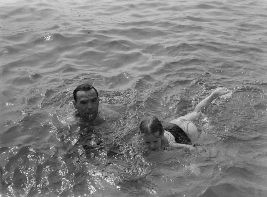 Le moniteur-sauveteur Leo Belec apprend à nager à la petite Maureen Allan. Ils sont dans une piscine extérieure à Verdun