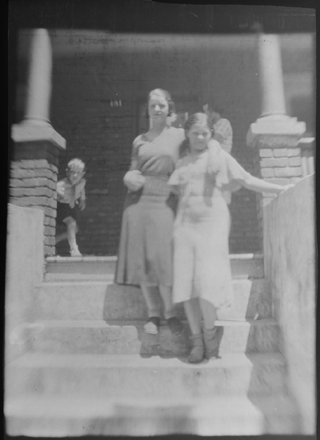 Copie d'une photographie montrant Gladys et Ruth dans les marches du perron d'une résidence familiale. En arrière-plan nous apercevons un enfant se cachant de la caméra