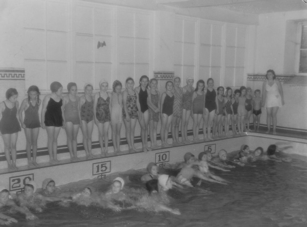 Des baigneuses participent à un camp de jour organisé par la «North End Young Men's Christian Association (Y.M.C.A.)» à Montréal. Elles sont dans une piscine intérieure