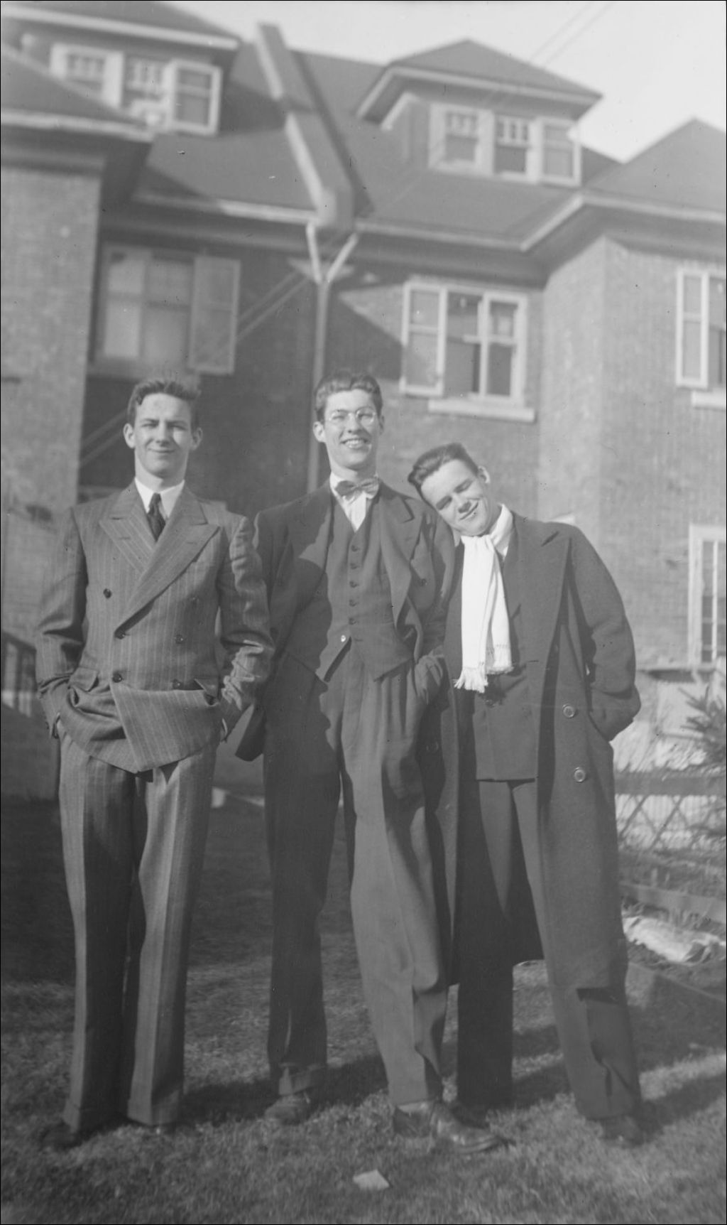 Nous voyons trois jeunes hommes debout devant des maisons en rangée