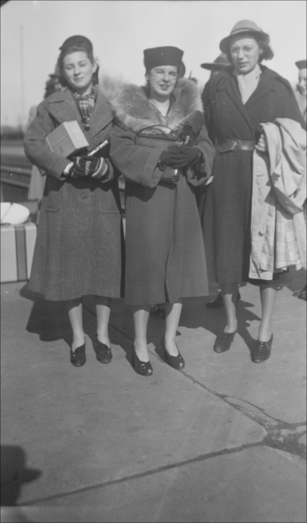 Trois femmes, vêtues de paletots et coiffées de chapeaux, se tiennent à l'extérieur