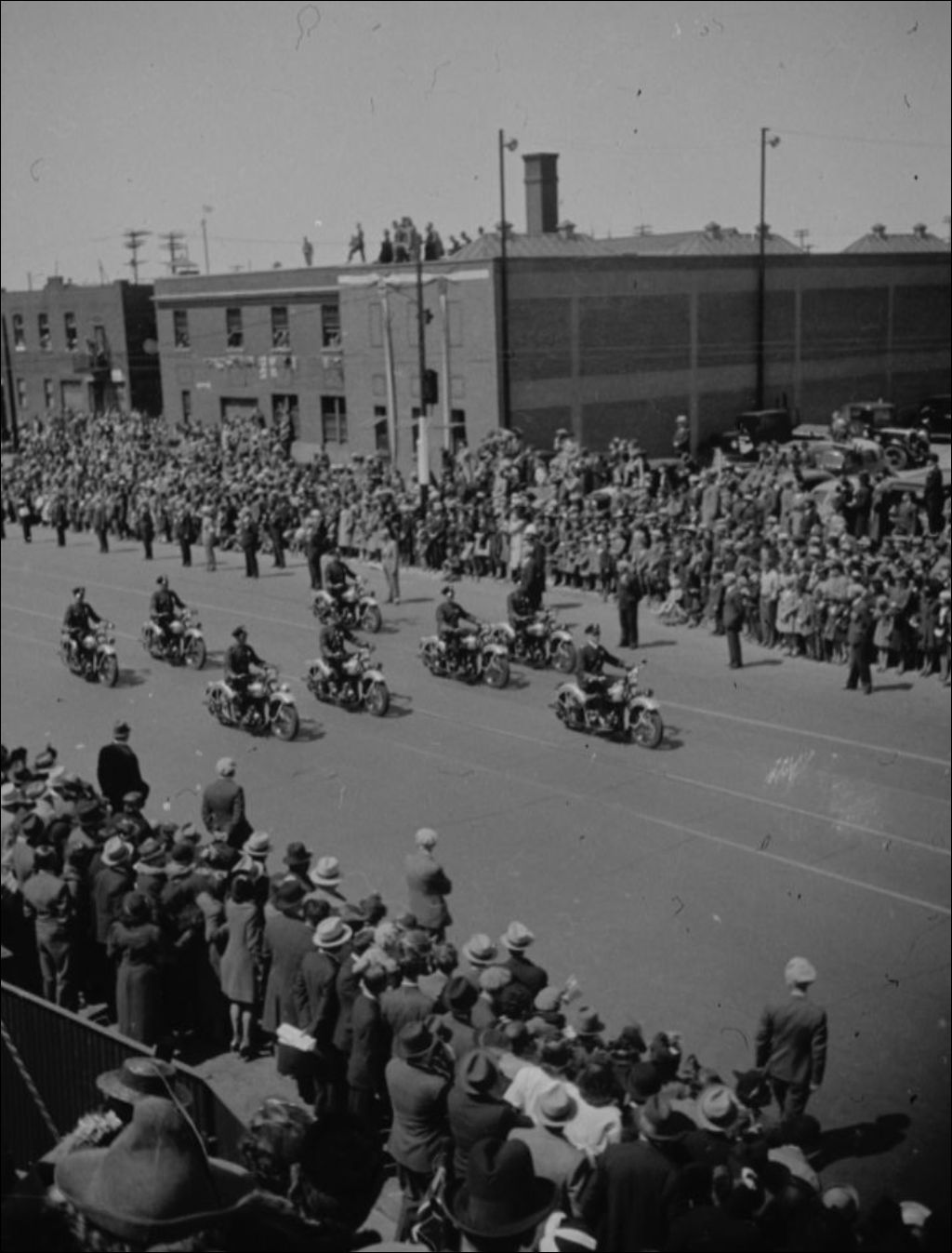 - Des policiers en motocyclette escortent la limousine du couple royal, le roi George VI et la reine Elisabeth, dans les rues de Montréal