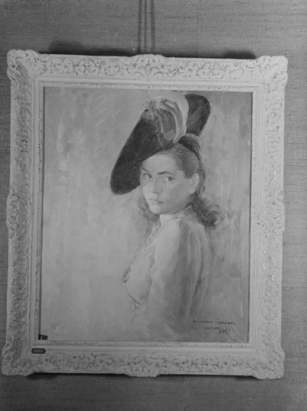 Nous voyons le portrait d'une jeune femme coiffée d'un chapeau signé «Francesco Iacurto»