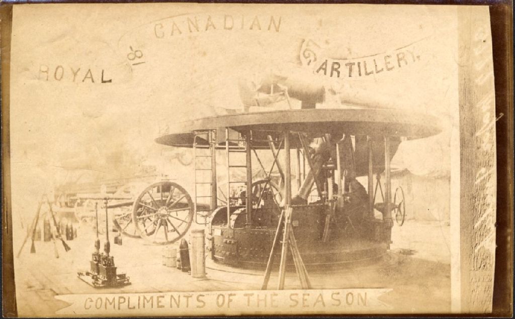 Vue de l'intérieur, en exposition le canon combiné, un montage photographique pour la saison des fêtes "Royal Canadian Artillery - 1897 - Compliments of the Season"