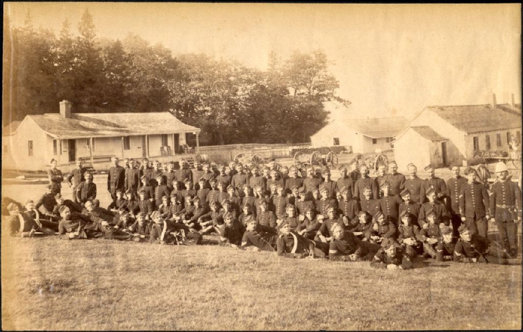 Vue éloignée de militaire près des bâtiments au camp du major Théodore L. Boulanger commandant de la Batterie d'Artillerie de Campagne, au camp Saint-Joseph