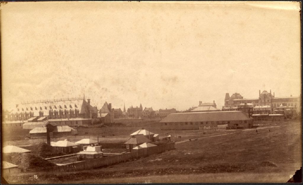 Vue panoramique prise sur les terrains à l'arrière du Manège militaire jusqu'au Parlement de Québec en passant par la résidence de Richard Barden, le Quebec Racket Club et l'école d'équitation (ancien Drill Shed)
