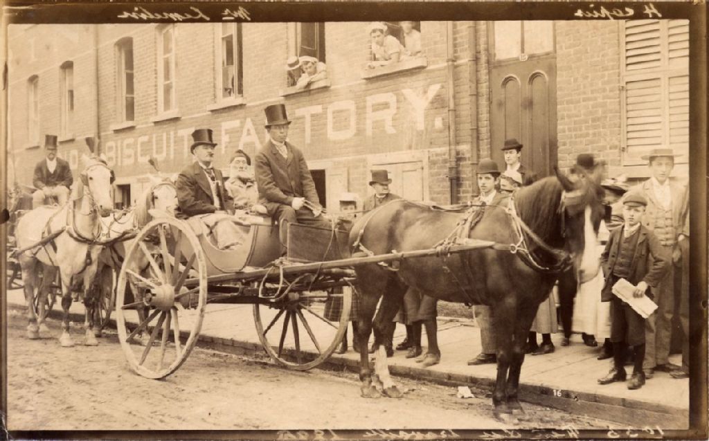 Vue rapprochée d'un landau avec un passager "Monsieur Lemelin", devant la manufacture du boulanger et fabricant de biscuits Thomas Hethrington