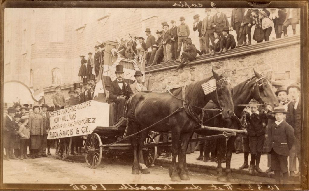 Vue rapprochée du char allégorique près des terrains sur le côté de l'église Saint-Jean-Baptiste, représentant "Achetez la Machine à Coudre - New-William - Quarantie pour dix ans - En vente Chez - Hudon, Paradis & Cie"