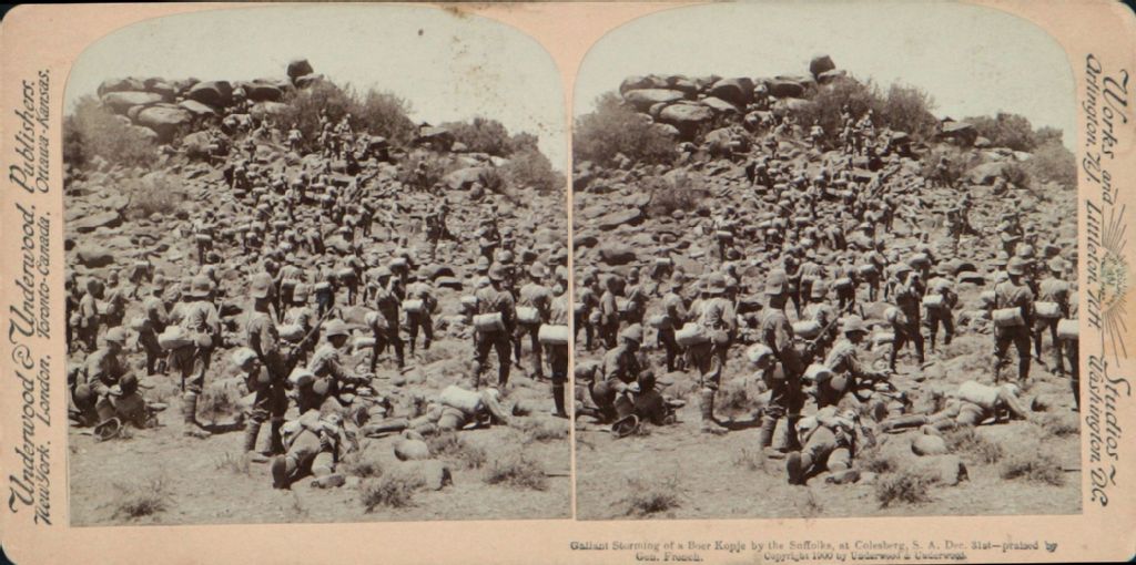 Titre des épreuves : "Le Coton est Roi - La vue d'une plantation, Géorgie, Etats-Unis" ; "L'assaut brillant donné par les Suffolks à un Kopjé Boer, à Colesberg, Afrique du Sud, le 31 déc. loué par le Général French" ; "Looking northeast over the Bay, from the New Market, Hong Kong, China"