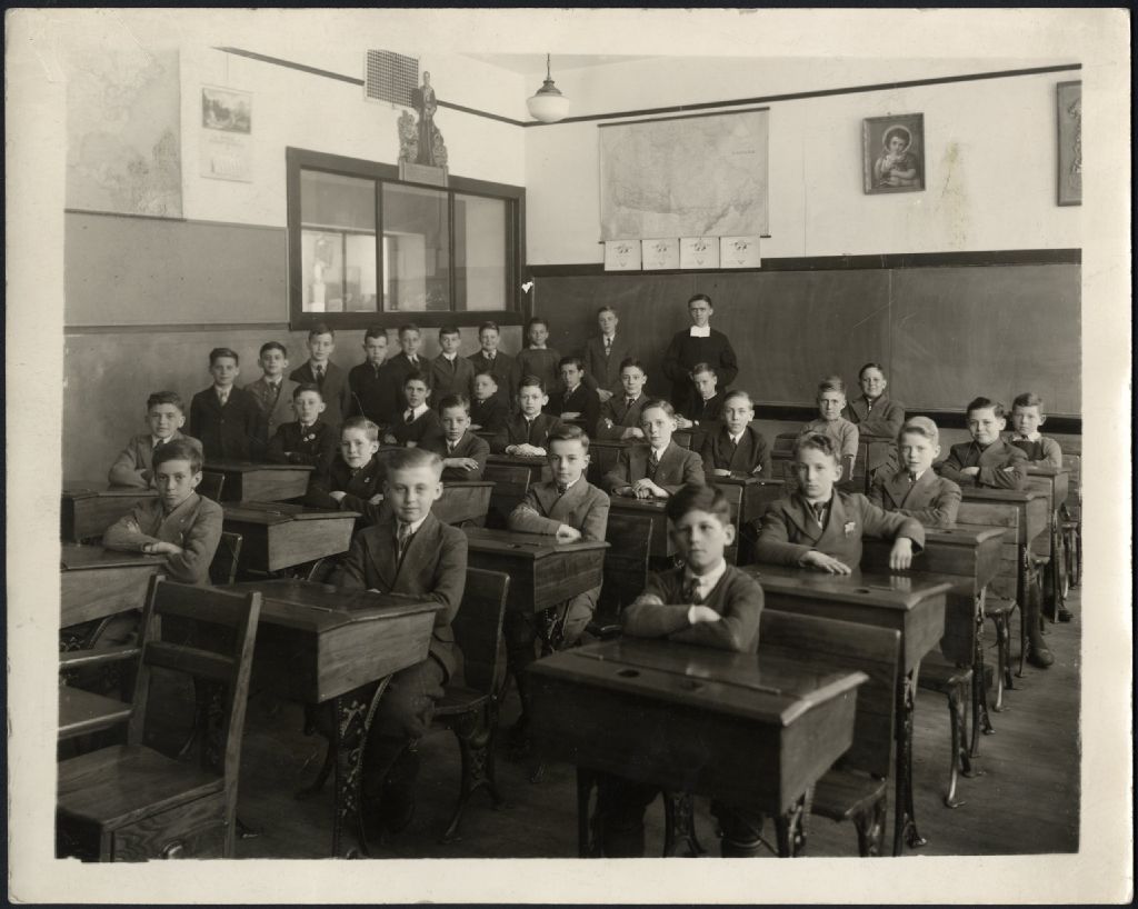 Classe d'élèves de 5e et 6e années 1939-1940 à l'Académie de La Salle, [1940?], Archives nationales à Gatineau, Fonds Léon Couture, (07H,P114,S1,D15), Photographe non identifié.