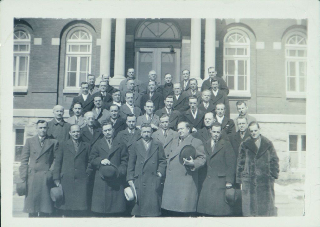 Groupe d'hommes en retraite fermée, debouts devant un édifice sur le boul. Sacré-Coeur à Hull