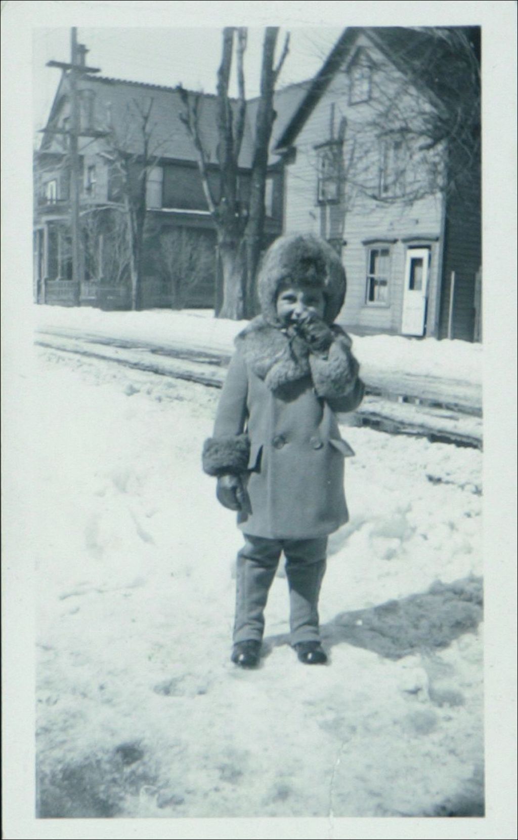 Enfant, en manteau d'hiver, sur la rue Champlain, enneigée, à Hull ; en arrière-plan la maison des Langlois