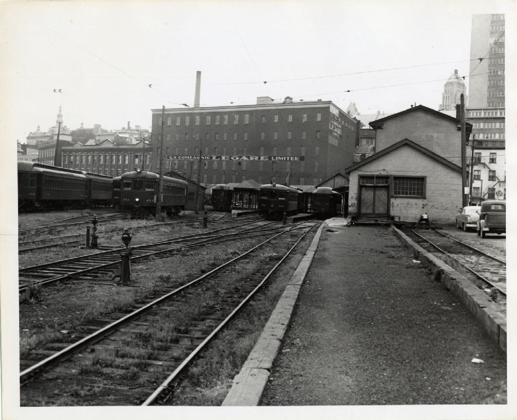 Arrière de la gare de la Quebec Railways, Light & Power Co., division Montmorency et de ses trains, [Vers 1950], Archives nationales à Québec, Fonds L'Action catholique, (03Q,P428,S3,SS1,D10,P9), Photographe non identifié.