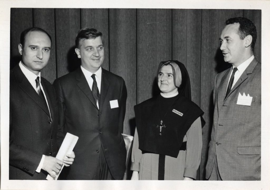 Dr Guy Vanier, Dr P. A. Marquis, Soeur Madeleine Roy et le Dr Harry Grantham, décembre 1966, Archives nationales à Québec, Fonds L'Action catholique, (03Q,P428,S3,SS1,D12,P15), Photographe non identifié.